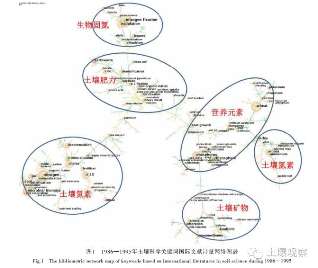 1986—1995年國際文獻計量網(wǎng)絡圖譜中聚成了6個相對獨立的研究聚類圈(圖1),聚類圈之間相對離散。根據(jù)圈中的高頻關鍵詞可歸納為土壤肥力、營養(yǎng)元素、土壤礦物、土壤氮素、生物固氮5個方面;其中有三個聚類圈均與土壤氮素研究有關,但它們所關注的內容不同。